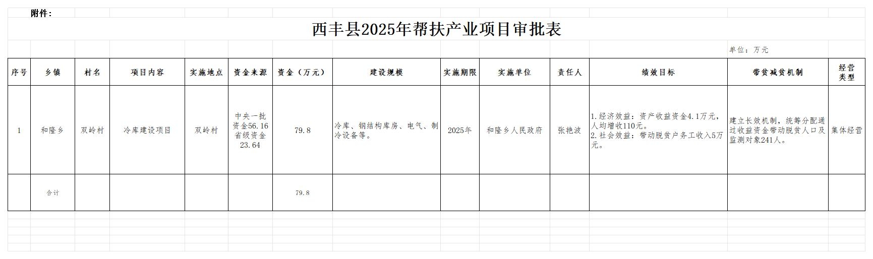 你乡所报双岭村冷库建设产业项目申请已收悉,该项目符合《西丰县产业扶贫项目暂行管理办法》(西委发〔2019〕21号)文件的有关规定,经西丰县人民政府常务会议通过,同意该项目的申请。和隆乡双岭村冷库建设产业项目安排财政专项资金79.8万元,望你单位按照批复项目抓紧组织实施,根据项目实施内容及相关程序,抓紧落实工作确保项目当年完工、当年见效,为巩固脱贫攻坚成果和乡村振兴提供有利保障,确保此项工作顺利完成。