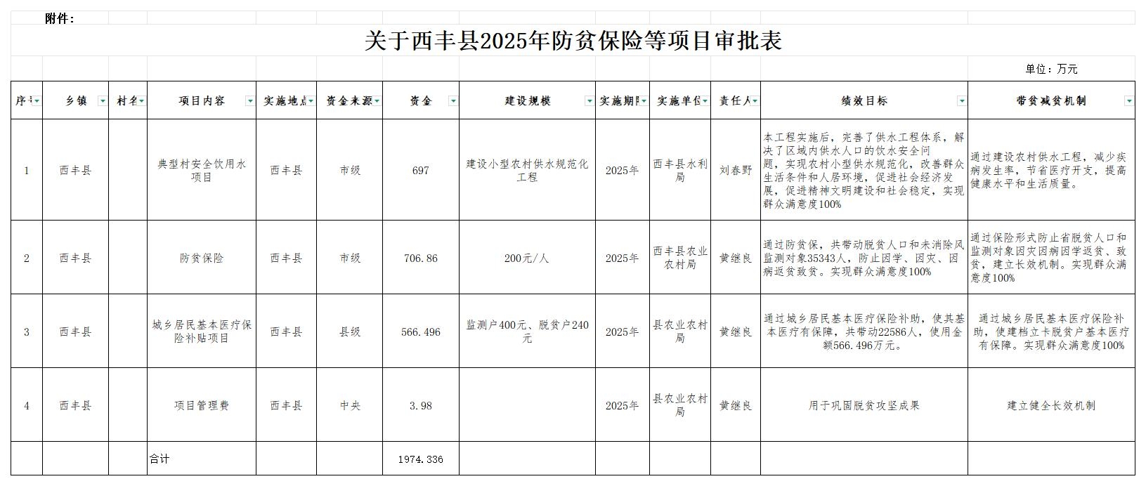 按照《关于印发〈辽宁省县级脱贫攻坚项目库建设工作 指导实施方案>的通知》的有关规定,县农业农村局提出了2025年计划实施项目申请,经西丰县人民政府常务会议审议通过典型村安全饮用水项目、防贫保险项目、城乡居民基本医疗保险补贴项目、项目管理费。望各单位按照批复项目抓紧组织实施,根据项目实施内容及相关程序,抓紧落实工作确保项目当年完工、当年见效,为巩固脱贫攻坚成果和乡村振兴提供有利保障,确保此项工作顺利完成。