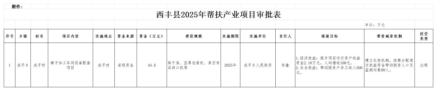 你乡所报成平村榛子加工车间设备配套产业项目申请已收悉,该项目符合《西丰县产业扶贫项目暂行管理办法》(西委发〔2019〕21号)文件的有关规定,经西丰县人民政府常务会议通过,同意该项目的申请。成平乡成平村榛子加工车间设备配套产业项目安排财政专项资金44.6万元,望你单位按照批复项目抓紧组织实施,根据项目实施内容及相关程序,抓紧落实工作确保项目当年完工、当年见效,为巩固脱贫攻坚成果和乡村振兴提供有利保障,确保此项工作顺利完成。