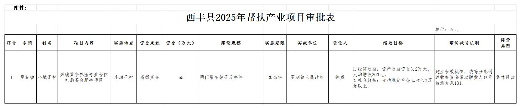 你镇所报小城子村兴瑞黄牛养殖专业合作社购买育肥牛产业项目申请已收悉,该项目符合《西丰县产业扶贫项目暂行管理办法》(西委发〔2019〕21号)文件的有关规定,经西丰县人民政府常务会议通过,同意该项目的申请。更刻镇小城子村兴瑞黄牛养殖专业合作社购买育肥牛产业项目安排财政专项资金65万元,望你单位按照批复项目抓紧组织实施,根据项目实施内容及相关程序,抓紧落实工作确保项目当年完工、当年见效,为巩固脱贫攻坚成果和乡村振兴提供有利保障,确保此项工作顺利完成。