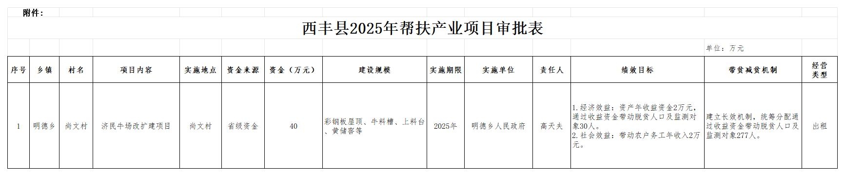你乡所报尚文村济民牛场改扩建产业项目申请已收悉,该项目符合《西丰县产业扶贫项目暂行管理办法》(西委发〔2019〕21号)文件的有关规定,经西丰县人民政府常务会议通过,同意该项目的申请。明德乡尚文村济民牛场改扩建产业项目安排财政专项资金40万元,望你单位按照批复项目抓紧组织实施,根据项目实施内容及相关程序,抓紧落实工作确保项目当年完工、当年见效,为巩固脱贫攻坚成果和乡村振兴提供有利保障,确保此项工作顺利完成。