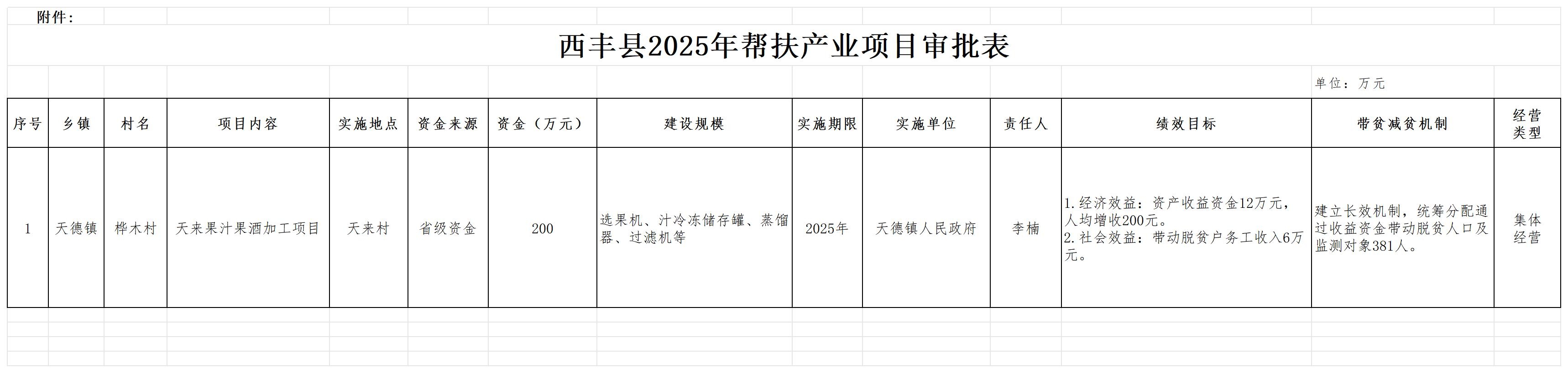 你镇所报桦木村天来果汁果酒加工产业项目申请已收悉,该项目符合《西丰县产业扶贫项目暂行管理办法》(西委发〔2019〕21号)文件的有关规定,经西丰县人民政府常务会议通过,同意该项目的申请。天德镇桦木村天来果汁果酒加工产业项目安排财政专项资金200万元,望你单位按照批复项目抓紧组织实施,根据项目实施内容及相关程序,抓紧落实工作确保项目当年完工、当年见效,为巩固脱贫攻坚成果和乡村振兴提供有利保障,确保此项工作顺利完成。