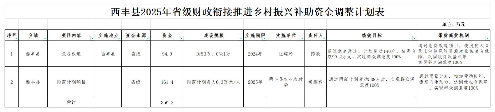 2025年,我县省级财政衔接推进乡村振兴补助资金共2568万元。根据西丰县2025年衔接推进乡村振兴工作实际需要,对省级财政衔接推进乡村振兴补助资金计划进行调整。具体调整情况如下: